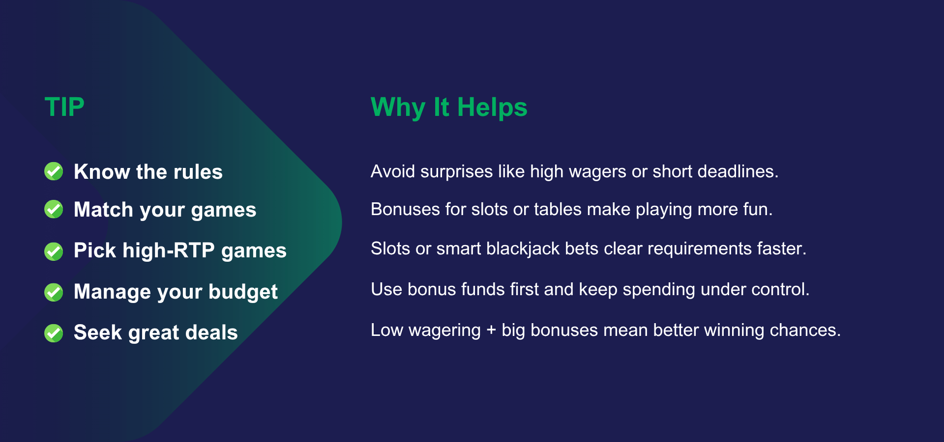 Love slots? Go for free spins. Prefer blackjack? Find table game bonuses. Picking bonuses that match your style makes gaming more fun and helps you meet requirements faster.